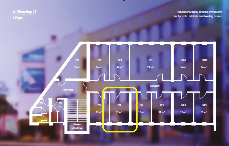 Oferowane biura do wynajęcia położone są w centralnej części Puław przy głównej handlowej ulicy miasta — Piłsudskiego 28. W sąsiedztwie nieruchomości znajdują się obiekty handlowe i usługowe: placówki bankowe, sklepy, restauracje, poczta oraz galerie handlowe.